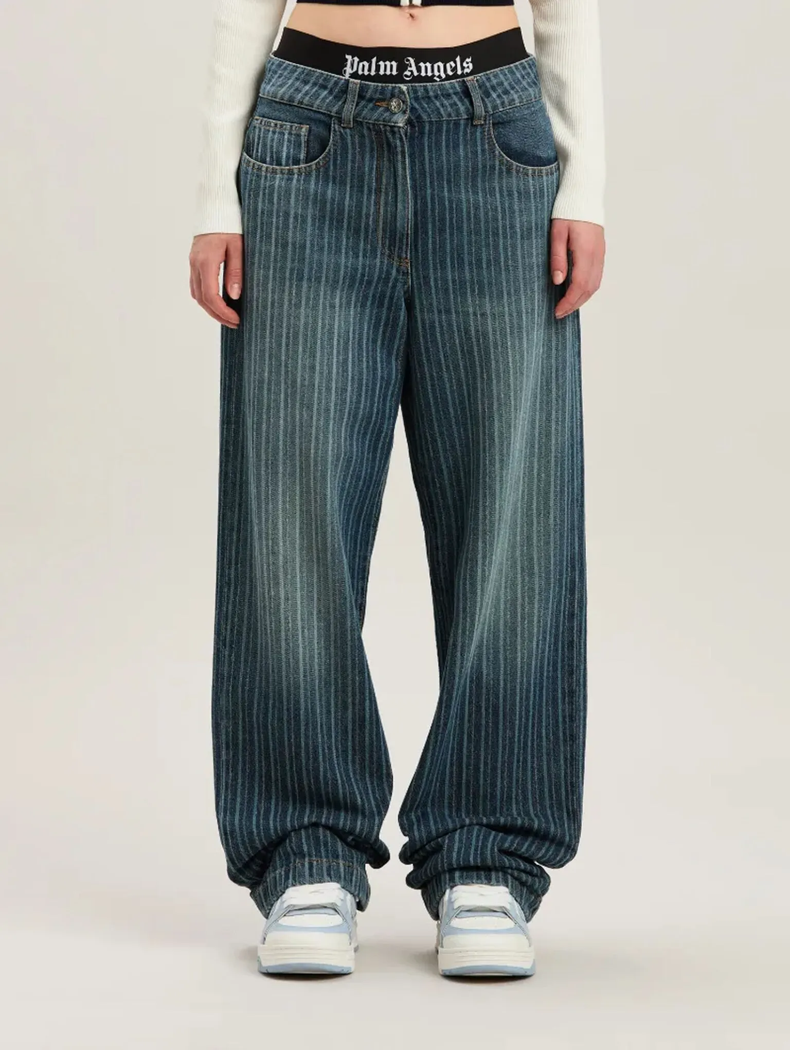Home WOMEN Laser Pinstripe Loose Denim Pant